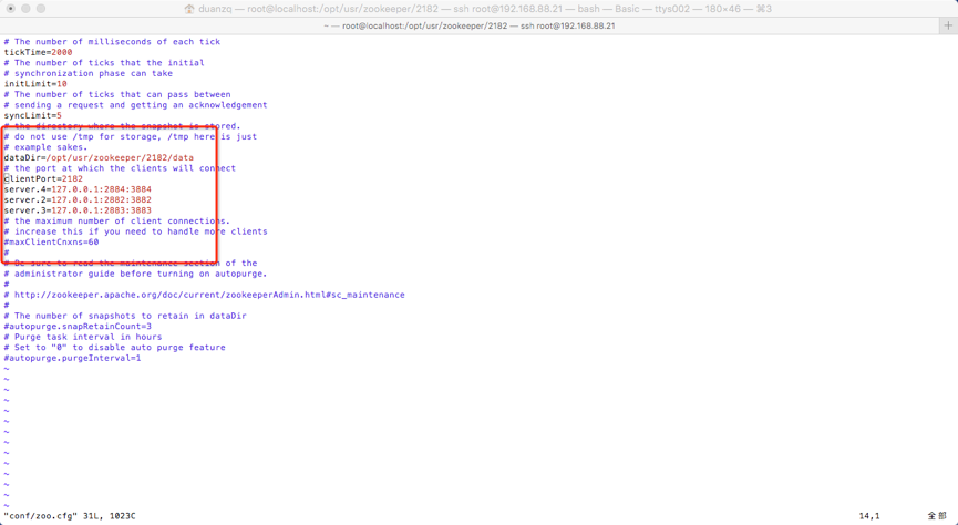 # The number of milliseconds of each tick tickTime=2000 # The number of ticks that the initial # synchronization phase can take initLimit=10 # The number of ticks that can pass between # sending a request and getting an acknowledgement syncLimit=5 # the directory where the snapshot is stored. # do not use /tmp for storage, /tmp here is just # example sakes. dataDir=/opt/usr/zookeeper/2184/data # the port at which the clients will connect clientPort=2184 server.4=127.0.0.1:2884:3884 server.2=127.0.0.1:2882:3882 server.3=127.0.0.1:2883:3883 # the maximum number of client connections. # increase this if you need to handle more clients #maxClientCnxns=60 # # Be sure to read the maintenance section of the # administrator guide before turning on autopurge. # # https://zookeeper.apache.org/doc/current/zookeeperAdmin.html#sc_maintenance # # The number of snapshots to retain in dataDir #autopurge.snapRetainCount=3 # Purge task interval in hours # Set to "0" to disable auto purge feature #autopurge.purgeInterval=1