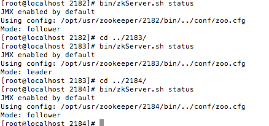 cd /opt/usr/zookeeper/2183 echo 3 >data/myid cd /opt/usr/zookeeper/2183 echo 2 >data/myid